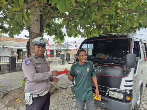 Bangka,CMNNews.ID — Sambut HUT ke-80 RI, Satlantas Polres Bangka tancap gas menggelar aksi simpatik dengan membagikan bendera merah putih kepada sopir angkot dan truk yang melintas di ruas Jalan Jenderal Sudirman, Sungailiat.